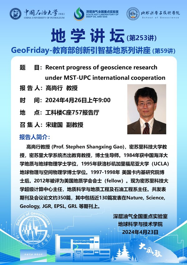 【地学讲坛第253讲】关于高尚行教授《Recent progress of geoscience research under MST-UPC international cooperation》学术报告的通知