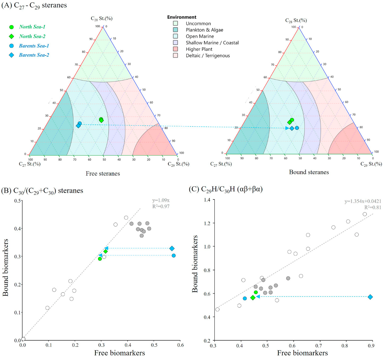 图1 北欧原油样品的游离态和键合态甾烷生物标志物对比图