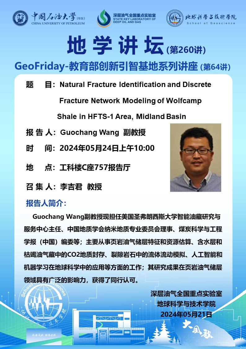 【地学讲坛第260讲】关于Guochang Wang 副教授 《Natural Fracture Identification and Discrete Fracture Network Modeling of Wolfcamp Shale in HFTS-1 Area, Midland Basin》学术报告的通知