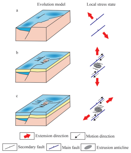 近年来,珠江口盆地油气勘探工作取得了一系列重要突破,其中位于文昌A凹陷的转换带内已发现超过2000万吨的油气量,是过去十年来珠江口盆地西部最大的油气发现。冰球突破豪华版官方网站李伟副教授团队基于三维地震反射数据对文昌凹陷进行研究,并利用几口深井对数据进行校准处理,确定了文昌凹陷新生代层序中7个关键的地震反射界面,识别并描述出了文昌A凹陷转换带的几何形态,并利用断层活动速率参数确定了转换爱主次级断裂的演化规律,恢复了文昌凹陷新生代的构造演化史(图1),计算得出了不同地质时期不同方向的变形速率,并由此可确定出各地质时期的区域伸展方向和强度。研究结果表明文昌A凹陷南部发育大型合成超覆转换带,转换带南部断裂和6号断裂为其主要断裂,在转换带内及周围发育大量北西向次级断裂,与主断裂几乎垂直或成大角度相交,东向断裂和北西向断裂的共轭交汇区为油气运移和聚集提供了更多的机会。此外,转换带发育受先存断裂与区域应力转换的相互作用控制(图2),在古新世和始新世,主要断裂的不同活动导致了接力斜坡和超覆转换带的形成;进入渐新世至早中新世时期,北东向和北西向的断裂在斜向伸展作用下重新激活,而转换带内的断裂发育主要是通过先存北西向断裂的重新激活来实现的。从中新世中期开始,在北北东向的伸展作用下,北东走向的走滑断裂占主导地位,并建立了低幅度的断裂背斜,其构造演化过程不仅展示了转换带的动态演化史,而且对于理解油气在该区域的分布具有重要意义。