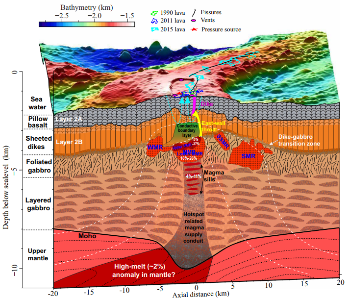 岩浆系统的结构和动力学过程在火山喷发和演化中起着根本性的作用。然而,在大多数活火山系统中,地壳岩浆库和输运管道很难进行精确成像。本论文针对Juan De Fuca洋中脊轴向海底火山岩浆系统成像不清问题(图1),利用多参数全波形反演方法获得了火山口下方的高分辨率纵波速度、衰减模型、温度场以及部分熔融模型。查明了上地壳多个岩浆囊的空间分布情况,并在火山口西侧发现了一个新的岩浆库。研究表明,主岩浆库上层的最大熔融分数约为15-32%,其他部分约为10%至26%。此外,在主岩浆库下方有一个熔融分数约为4-11%的岩浆输送通道,在东部火山口下方有一个低速喉道,将主岩浆囊与海底喷发裂缝连接起来。这些发现揭示了Juan De Fuca洋中脊轴向海底火山的非对称岩浆管道系统(图2),为1998年、2011年和2015年岩浆喷发提供了新机制。