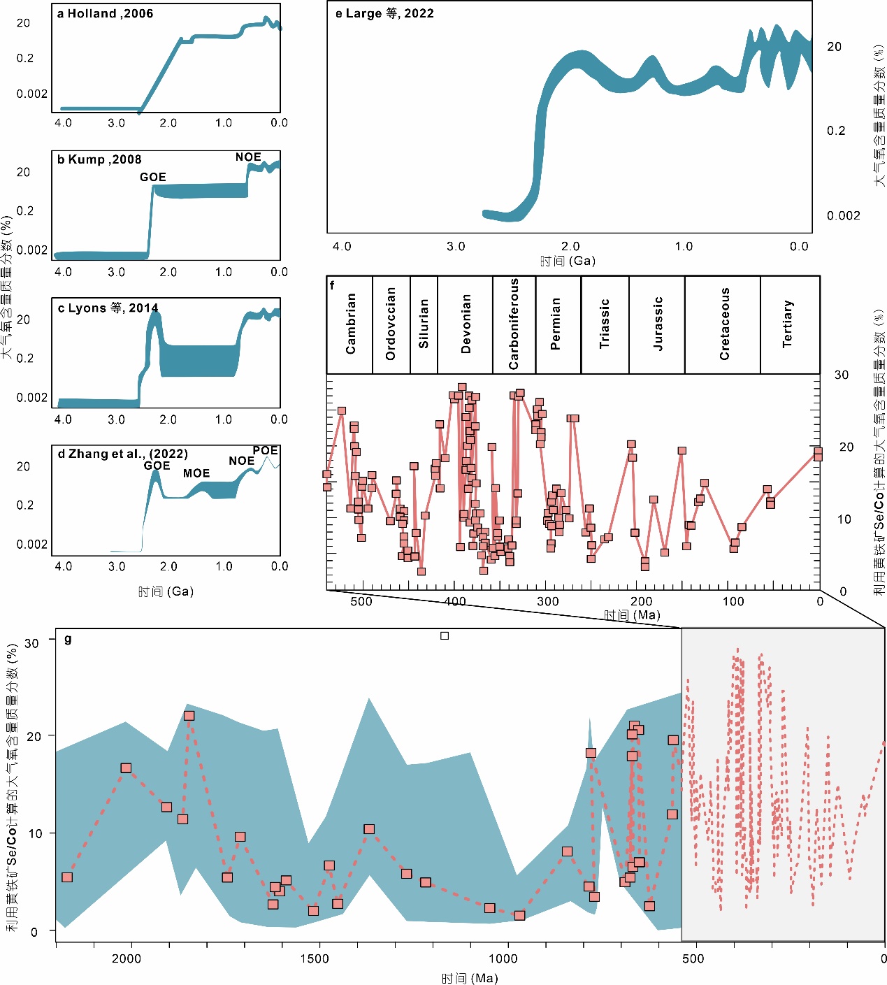 图2 大气氧化模型:(a) Holland (2006); (b) Kump (2008); (c) Lyons等(2014); (d)张水昌等(2022);(e, f, g) Large等 (2014, 2019, 2022)。