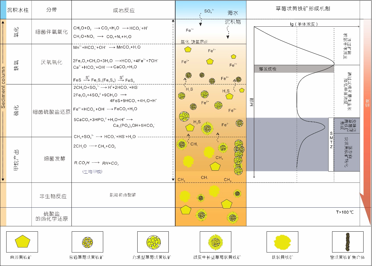 另一方面,由于作为主要的金属硫化物之一,黄铁矿中的硫来源多样,文章将其分为由微生物主导的微生物硫酸盐还原作用(MSR)及由温度驱动的热化学硫酸盐还原作用(TSR)。其中根据硫酸盐还原作用发生的位置及反应物的差异,将MSR进一步划分为主要在浅层发生的BSR及聚焦于相对深层SMTZ区域发生的AOM-SR,通过整理前人文献,文章对不同硫源的黄铁矿形态差异进行总结。