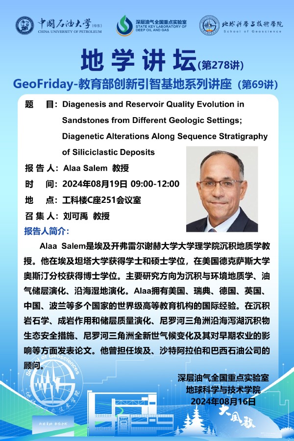 【地学讲坛第278讲】关于Alaa Salem教授《Diagenesis and Reservoir Quality Evolution in Sandstones from Different Geologic Settings》和《Diagenetic Alterations Along Sequence Stratigraphy of Siliciclastic Deposits》学术报告的通知