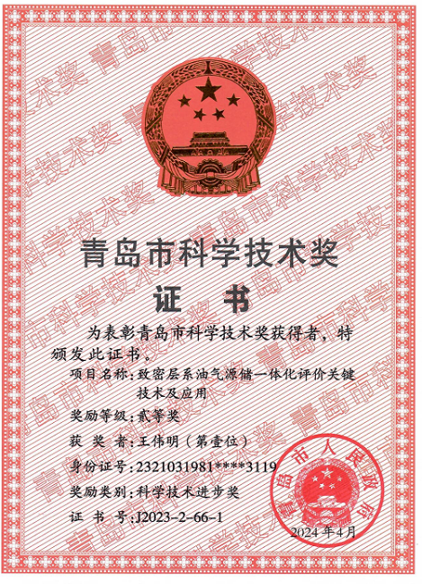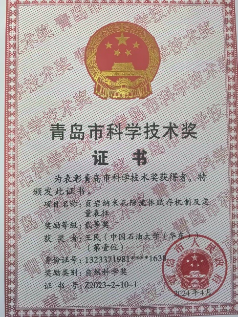 2024年8月16日,青岛市科技创新大会召开,对获得2023年度青岛市科学技术奖的项目和人员进行表彰。冰球官网王民教授负责的《页岩纳米孔隙流体赋存机制及定量表征》项目获自然科学二等奖、王伟明副教授负责的《致密层系源储一体化评价关键技术及应用》项目获科技进步二等奖。