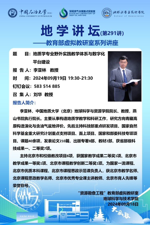 【地学讲坛第291讲】关于李亚林 教授《地质学专业野外实践教学体系与数字化平台建设》学术报告的通知