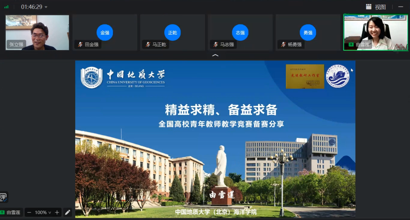 由雪莲副教授从自己参加全国青年教师讲课比赛的亲身经历入手,从全国高校青年教师教学竞赛介绍、参赛案例、解构参赛教学材料设计和参赛课堂展示节段设计原则及方法等几个方面深入细致地向参会教师分享了赛前备课和讲课的细节与经验。她讲述了历届讲课比赛对课程思政的系统要求,结合她的参赛案例展示了课程思政融入、联系学科前沿、动画展示等细节。针对全国青教赛教学材料的设计,由雪莲介绍了封面设计、课程名称、学情分析、教学目标、教学思想、课程资源、教学内容、教学重点与难点、教学方法与工具、教学安排、教学评价、预习任务与课后作业等内容,其中,教学目标包括:知识目标、能力目标和情感价值,向学生传达地质精神和家国情怀。