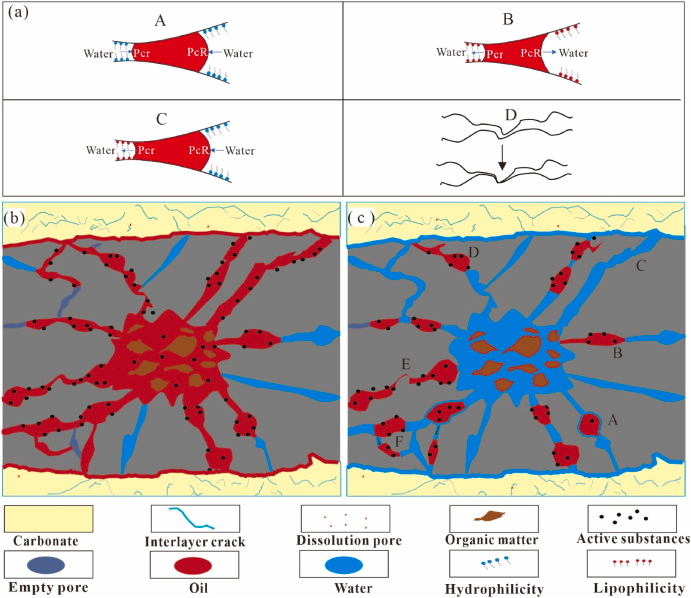 在本研究中,选择了三种类型的岩相页岩,以及核磁共振 (NMR)、N2采用吸附法 (NP)、注汞孔隙度法 (MICP) 和岩石热解法研究了动态水自发渗吸过程中页岩油的流动机理和剩余分布。结果表明:I.型页岩中的微孔以墨瓶状为主,具有弱水湿性,而中孔和大孔类则表现出弱油湿;II 型页岩的微孔主要为窄狭缝状,该型页岩除大孔外呈弱水湿性,而 III 型页岩的微孔主要为平行板状孔隙,所有孔隙均表现出弱水湿和混湿。水的贡献 (MnCl2解决方案)对页岩油采收率的吸收率很高,范围从 27.5% 到 55.5% 不等,主要是由于微孔的贡献。微孔和大孔的利用率相对较高(分别为平均 79% 和 86%),而中孔的利用率最低。页岩油在微孔中的回收率与石英、长石和粘土矿物呈正相关,并且与小于 10 nm 的孔喉控制的孔隙体积成正比。此外,弱水湿或混湿的微孔对页岩采收率有显著影响。基于以上因素,提出了页岩油自发渗吸作用下的流动机理:MnCl2溶液进入亲水性微孔,并驱动微孔中的油进入亲脂性中孔。这部分油可利用微孔两侧的毛细管压差,通过中孔传递到微裂缝并排出;总结了I.型页岩吸水后剩余油的分布规律,为湖相页岩油的勘探开发提供了理论支撑。