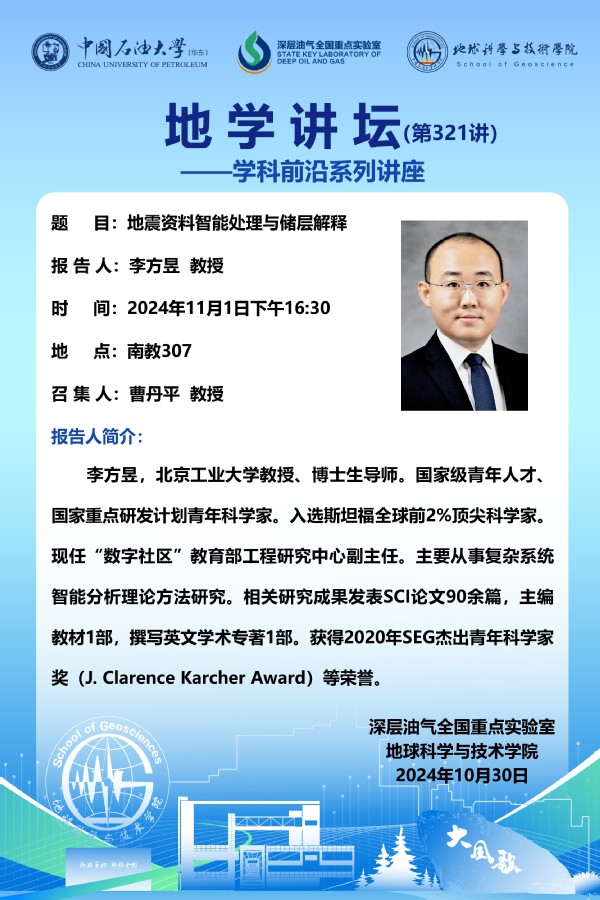 【地学讲坛第321讲】关于李方昱 教授《地震资料智能处理与储层解释》学术报告的通知
