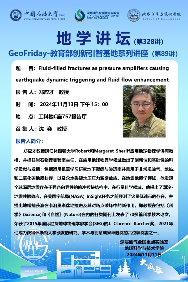 【地学讲坛第328讲】关于 郑应才 教授《Fluid-filled fractures as pressure amplifiers causing earthquake dynamic triggering and fluid flow enhancement》学术报告的通知