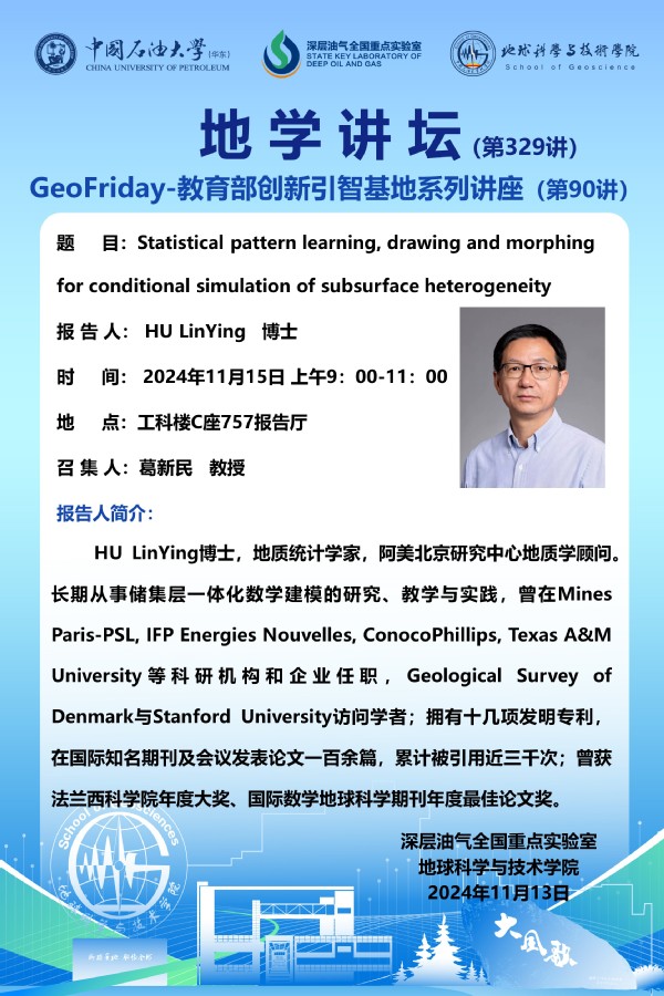 【地学讲坛第329讲】关于 HU LinYing 博士 《Statistical pattern learning, drawing and morphing for conditional simulation of subsurface heterogeneity》学术报告的通知