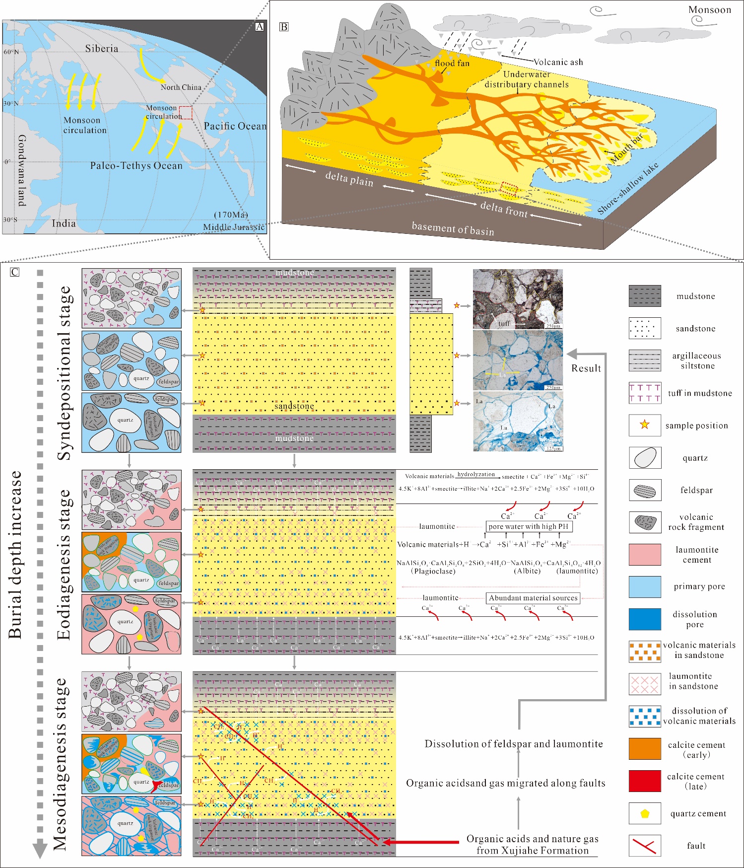 约1.75亿年前,四川盆地周缘经历了火山活动,火山爆发后遗留的物质被沉积并充填于沙溪庙地层中。这些火山物质在地下深处经历了复杂的化学变化(图1),它们在水和温度变化的影响下,释放出包括硅(Si4+)、铝(Al3+)、钙(Ca2+)、镁(Mg2+)、铁(Fe2+)和钾(K+)在内的多种阳离子。这些阳离子是成岩过程中形成多种矿物的关键前体物质。火山物质蚀变易形成化学性质不稳定的蒙脱石粘土矿物。随着地层温度的升高至70至100℃,蒙脱石在富含钾的环境中可转化为伊利石;而在富含铁和镁的环境中,则可转化为绿泥石。这些转化过程中,会释放出更多的硅和钙离子,为岩石的进一步化学变化提供原料。随着时间的推移,油气和有机酸从地下深处沿裂缝迁移进入沙溪庙组。这一过程引发了一系列的化学反应,有机酸促使长石和浊沸石胶结物溶解,同时促进了新的矿物的形成。这些研究成果首次详细揭示了四川盆地沙溪庙组火山物质在成岩过程中的重要作用,不仅为四川盆地沙溪庙组的储层质量评价提供了新的视角,也为类似盆地的油气勘探提供了理论依据。