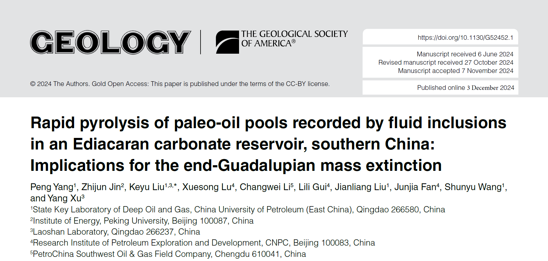近日,地球科学与技术学院刘可禹教授团队联合北京大学金之钧院士和中石油勘探开发研究院CNPC盆地构造与油气成藏重点实验室等单位在沉积盆地地质流体研究方面取得新进展,相关成果《流体包裹体记录了中国南方埃迪卡拉纪碳酸盐岩储层中古油藏的快速热解:对瓜德鲁普世末期大灭绝的影响》(Rapid pyrolysis of paleo-oil pools recorded by fluid inclusions in an Ediacaran carbonate reservoir, southern China: Implications for the end-Guadalupian mass extinction)发表在地球科学领域国际顶级期刊Geology上。论文第一作者为杨鹏博士后,通讯作者为刘可禹教授;冰球突破豪华版官方网站为第一署名单位,该研究得到国家自然科学基金、中石油科技发展项目、山东省自然科学基金以及中国博士后科学基金项目的联合资助。