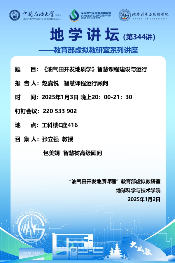 【地学讲坛第344讲】教育部虚拟教研室活动-关于赵嘉悦 《油气田开发地质学》智慧课程建设与运行 讲座的通知