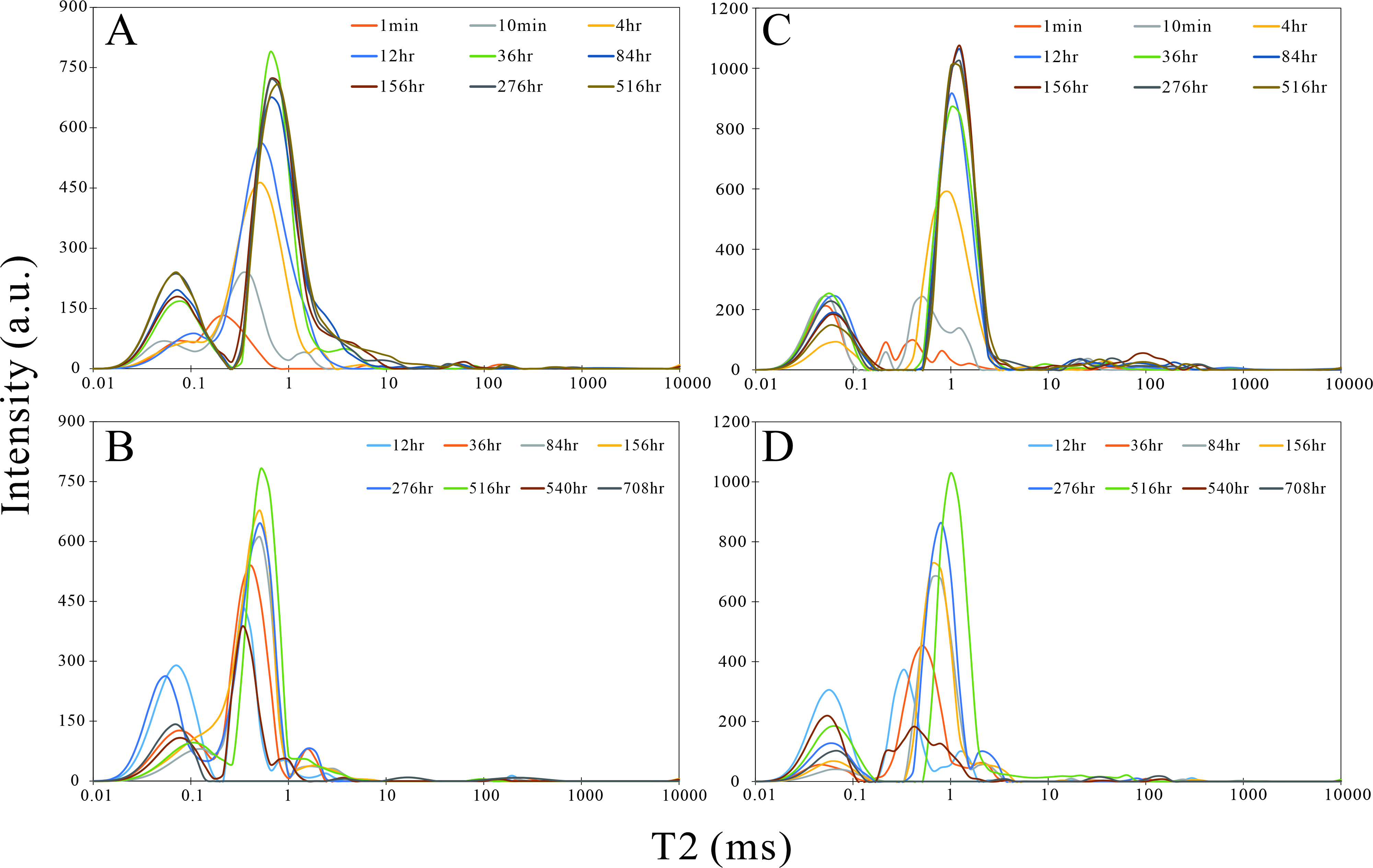 图2两个样品的T2核磁共振曲线(A和C,自发渗吸;B和D,水蒸气吸附)