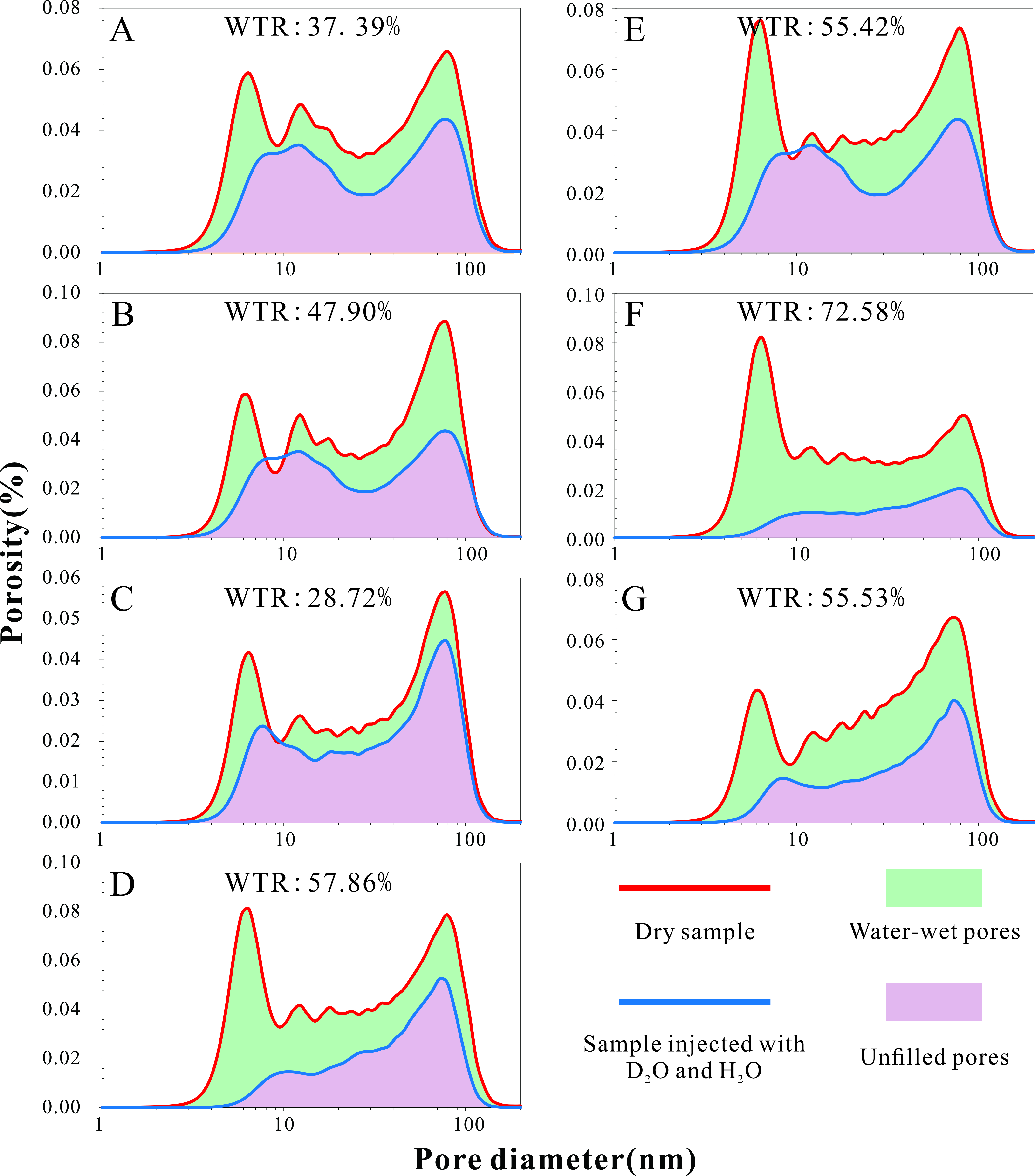 图1衬度对比-小角中子散射结果,(A) X-14079, (B) X-14095, (C) X-14113, (D) X-14125, (E) X-14153, (F) X-14183, (G) X-14199. WTR(亲水孔-总孔比例)