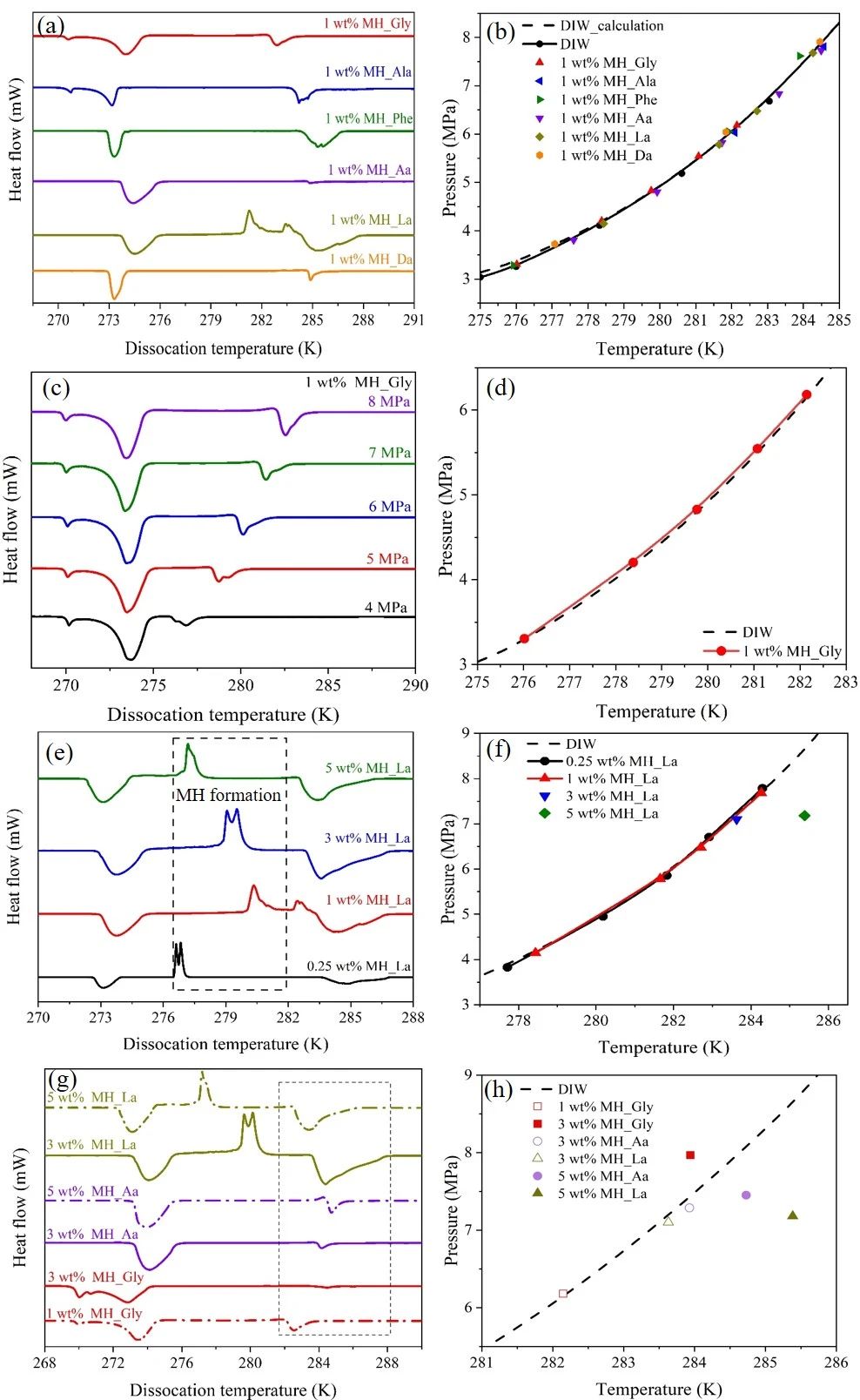 图2为不同碳链长度的OM溶液对MH形成热力学性质的影响。热流曲线表明,随着初始压力的增加,冰的融化温度保持相对不变。相比之下,MH的分解温度随着初始压力的升高而升高。这种现象可归因于在更高的压力下破坏MH结构并从水合物相中释放CH4的难度增加,因此MH分解需要更高的温度。 不同浓度OM研究结果表明,高浓度的Aa和La可以促进MH的形成。相反,随着Gly浓度的增加,MH_Gly体系中MH的分解峰面积逐渐减小。当Gly含量为3 wt%时,MH的相平衡条件向较低温度和较高压力方向转移。这表明,随着浓度的增加,Gly对MH的抑制作用增强。