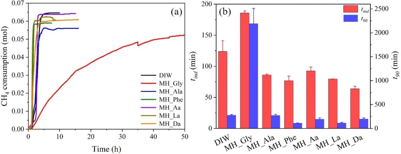 长碳链OM(Aa、La和Da)促进了MH形成,而短碳链OMs(如Gly和Ala)则表现出抑制作用。然而,具有短碳链和苯环的Phe对MH的形成具有促进作用。这种现象可能归因于长碳链OM和含苯环OM在MH成核过程中降低吉布斯自由能,并在MH生长阶段诱导松散多孔的结构和爬壁现象,从而提高CH4的传质效率,进而提高MH生长速率。因此,具有较长碳链和疏水官能团的OM更有利于MH的成核和生长,而具有较短碳链和亲水官能团的OM则阻碍了MH的形成动力学。
