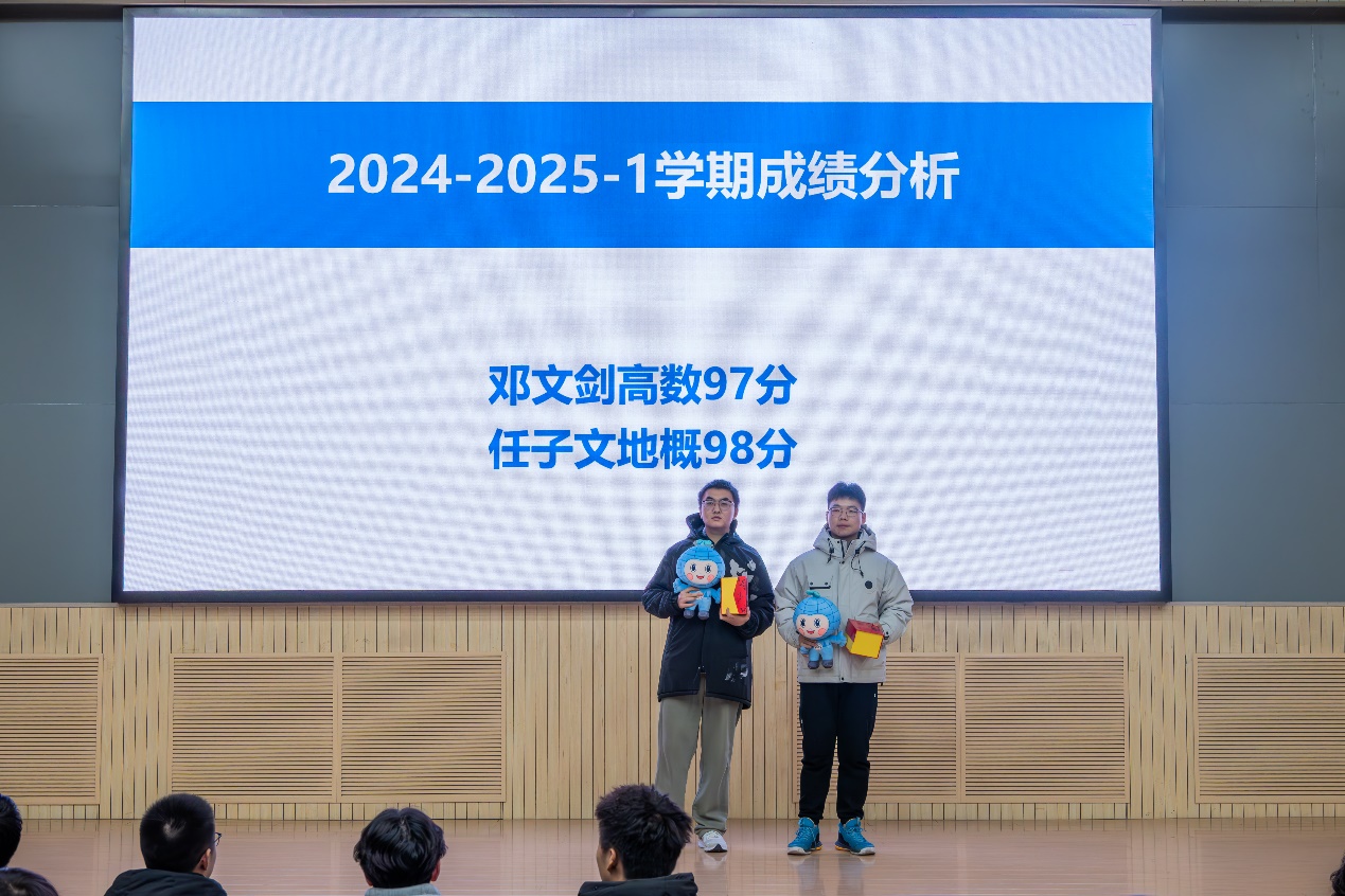 会上,对大一上学期《地球科学概论》《高等数学(2-1)》两门课程成绩年级排名第一的两位同学进行奖励,以期鼓励大家向优秀同学学习好的经验和方法,不能“及格就万事大吉”,而是要不断精进、追求卓越,及时结合自身情况反思学习状态。英飞希望同学们要继续保持大一上学期昂扬向上的精神风貌,学会对自己的成长发展负责;要坚持以学习为中心,走全面发展之路;要树立安全意识,避免网络诈骗、安全事故等情况的发生。