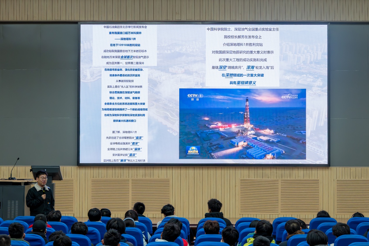 徐明权结合近期“深地塔科1井”万米深井胜利完钻的案例,与同学们分享了其对地球科学领域科学研究和油气勘探行业的重大影响,以及其为油气勘探领域青年学生带来的重要机遇,希望同学们正确看待行业发展形势,提高专业自豪感和使命感,扎扎实实练好学科专业基本功,为国家能源战略和实现人生价值积蓄力量。同时,他结合梁启超先生1922年在苏州学生联合会上的讲演《为学与做人》,勉励同学们在人生的黄金时期,要涵养正确的人生观、世界观、价值观,形成明辨笃实的品格和根本判断力;要充分利用一流学科优势资源,追求精深学问,塑造自己的核心竞争力。