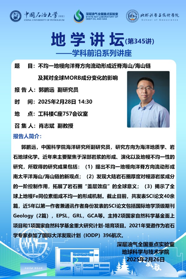 【地学讲坛第345讲】关于 郭鹏远 副研究员《不均一地幔向洋脊方向流动形成近脊海山/海山链及其对全球MORB成分变化的影响》学术报告的通知