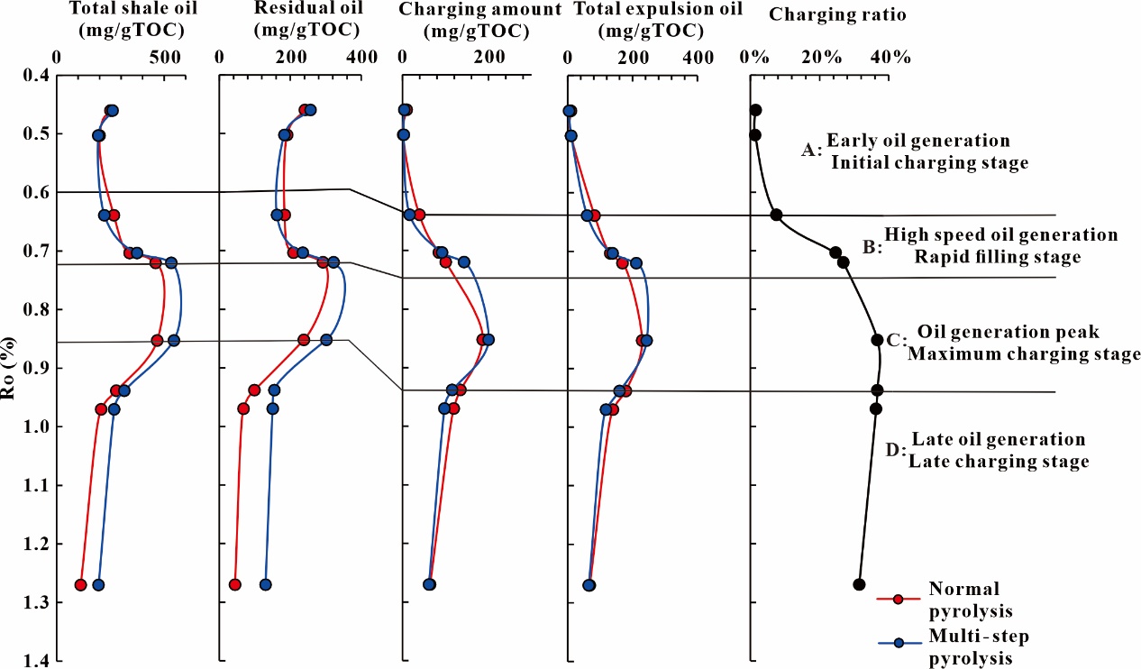 基于高温高压热模拟实验结果,综合总有机碳含量、常规岩石热解、多温阶岩石热解、页岩油充注率等,将粉砂岩夹层型页岩油充注过程分为4个阶段:( A )初始充注阶段,页岩油生成量少,可动性低,阶段划分曲线形态平稳;( B )快速充注阶段,页岩油生成量、OSI、充注率均快速上升,曲线斜率变化大;( C )最大充注阶段,页岩油生成量、OSI、充注率达到最大值,阶段划分曲线平稳;( D )充注末期,页岩油生成量快速下降,充注量减小(图1)。