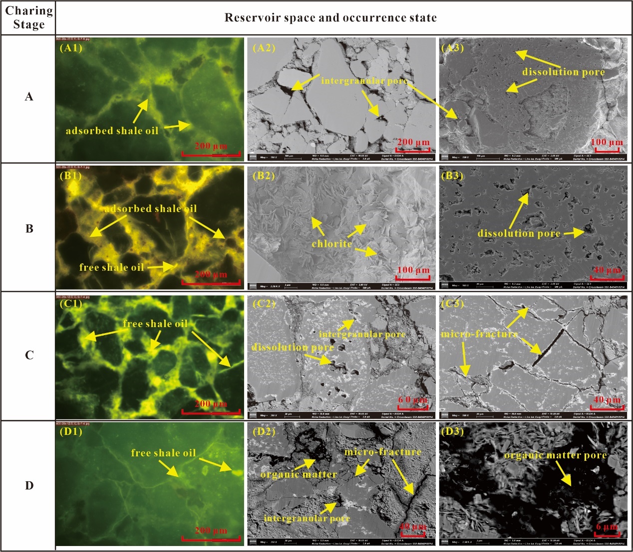 基于页岩油充注阶段划分,不同阶段无机矿物演化对储集空间类型的影响存在差异(图2)。起始充注阶段(A):发育较大的原生粒间孔及少量溶蚀孔、残余粒间孔,页岩油以吸附态存在,荧光性微弱。快速充注阶段(B):有机酸开始溶解不稳定的长石等矿物,大量溶蚀孔形成,游离态页岩油主要赋存于粒间孔,黏土矿物表面为吸附态,荧光亮度与范围明显增强。最大充注阶段(C):粒间孔、溶蚀孔、晶间孔等储集空间均有页岩油分布,观察到强烈黄绿色荧光,主要为游离态。充注末期(D):超压使得更多的微裂缝出现,孔隙演化趋于稳定,页岩油生成量减小,荧光性减弱。