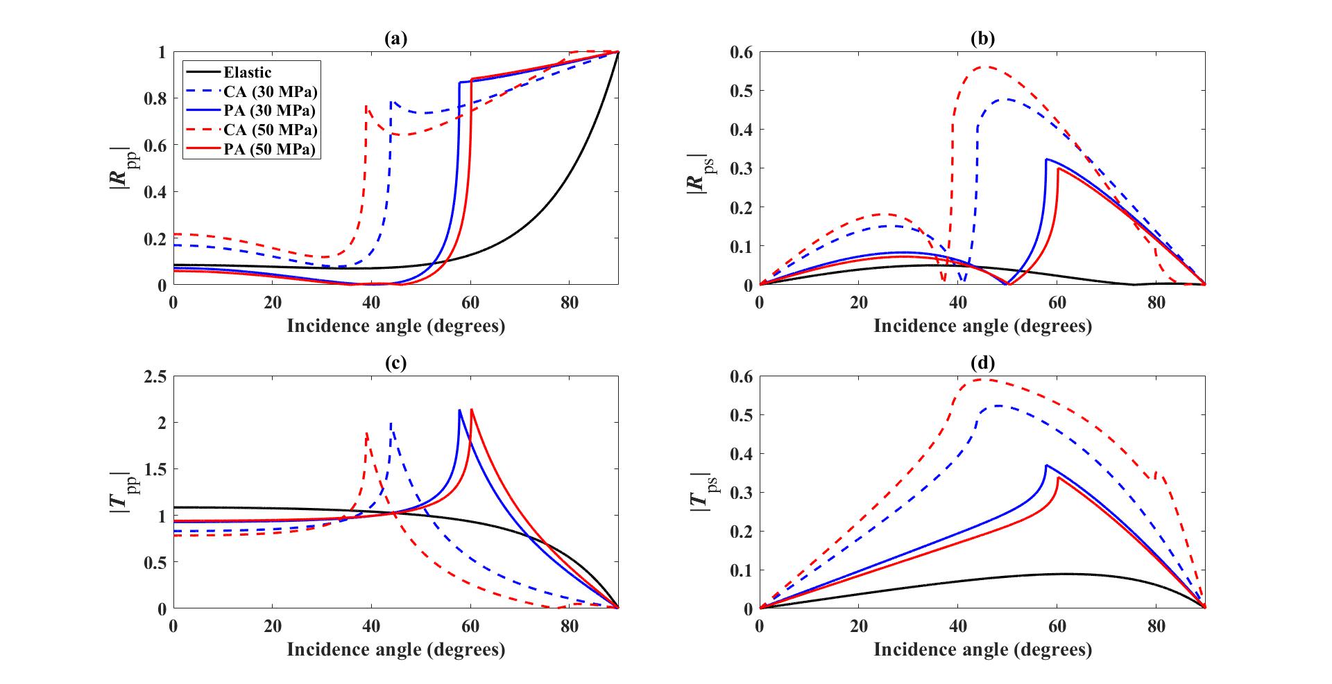 图1. 不同围压条件下,向下入射P波对应的(a)反射P波、(b)反射S波、(c)透射P波、(d)透射S波的绝对值随入射角变化关系:黑色曲线为弹性理论结果,彩色虚线为经典声弹性理论预测,彩色实线为Padé声弹性理论预测