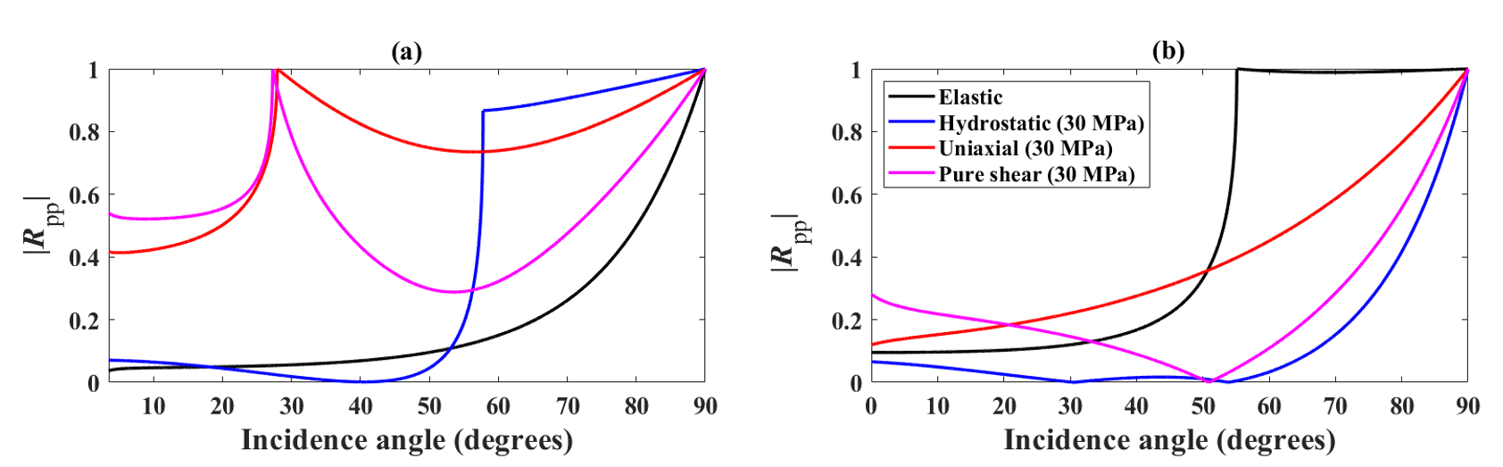 图2. 三种典型加载模式(10 MPa)下行(a)与上行(b)入射P波的反射系数绝对值随入射角变化的对比:黑色曲线为传统弹性理论结果,彩色曲线为Padé声弹性理论预测值