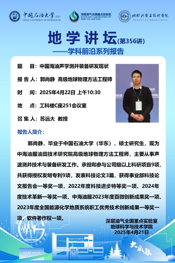 【地学讲坛第356讲】关于郭尚静高级地球物理方法工程师《中国海油声学测井装备研发现状》学术报告的通知