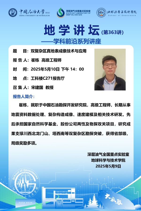 【地学讲坛第363讲】关于崔栋 高级工程师《双复杂区真地表成像技术与应用》学术报告的通知