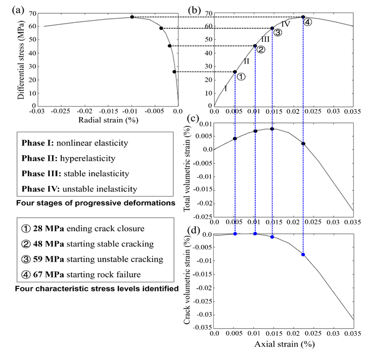 图1.一组人工砂岩在单轴压缩测试中获得的渐进变形应力-应变图