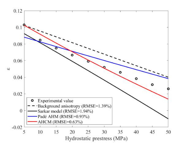 图2. 有效Thomsen参数ε(左图)与δ(右图)在不同静水压力条件下各种逼近模型结果对比,包括实验测量结果、应力诱导的背景各向异性、Sarkar弱各向异性模型、Padé AHM等效各向异性模型以及AHCM等效各向异性模型,图中标注了各模型对应的均方根误差(RMSE)
