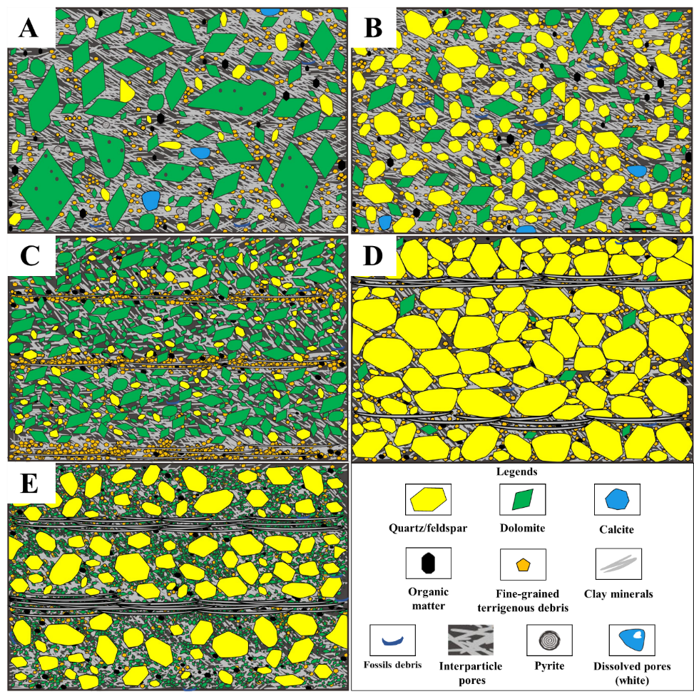 本研究以渤海湾盆地沧东凹陷古近系孔店组为例,结合岩石学、地球化学及多种孔径定量表征技术,构建了不同岩相类型下的孔隙系统模式,并探讨了储层品质的主控因素。研究识别出五类主要岩相类型。结果表明,不同岩相均发育多种类型孔隙,尤其以矿物颗粒间无机孔为主,且脆性矿物含量、纹层发育程度和有机质含量是影响孔隙系统的主要因素。其中,富有机质纹层状长英质页岩和富有机质纹层状灰云质页岩的储集性能突出,不仅具备良好生烃潜力,还富含脆性矿物,是该区页岩油勘探的优选目标。