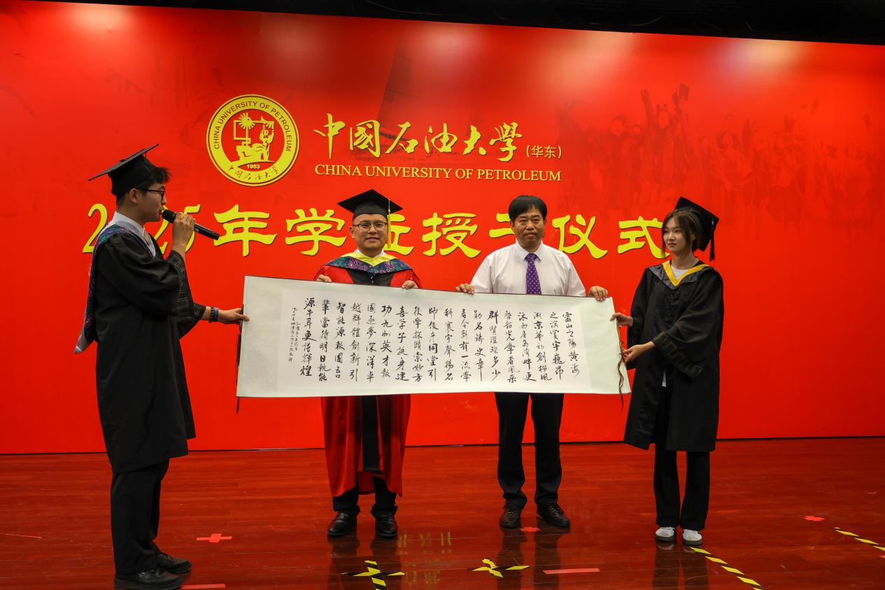 学位授予仪式后,毕业生代表孙雅楠、朱雪蕾、杨秀金、孙维江同学分别向宗兆云教授、苏远大教授、张宪国教授、王健教授献花,谷雨帆、范思琦同学代表2025届全体毕业生向学院赠送礼物,《沁园春·一流风采》由2021级本科生集体创作,本研2101班赵方智同学书写。