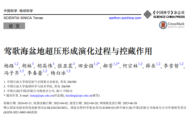 Yang L, Hu L, Hu G, Zhang Y, Tian J, Hao F, He Z, Xue Y, Li X, Feng Z, Li C, Yang B. 2025. Formation and evolution of overpressure and its controlon hydrocarbon accumulation in the Yinggehai Basin. Science China Earth Sciences, doi:https://doi.org/10.1007/s11430-024-1577-4