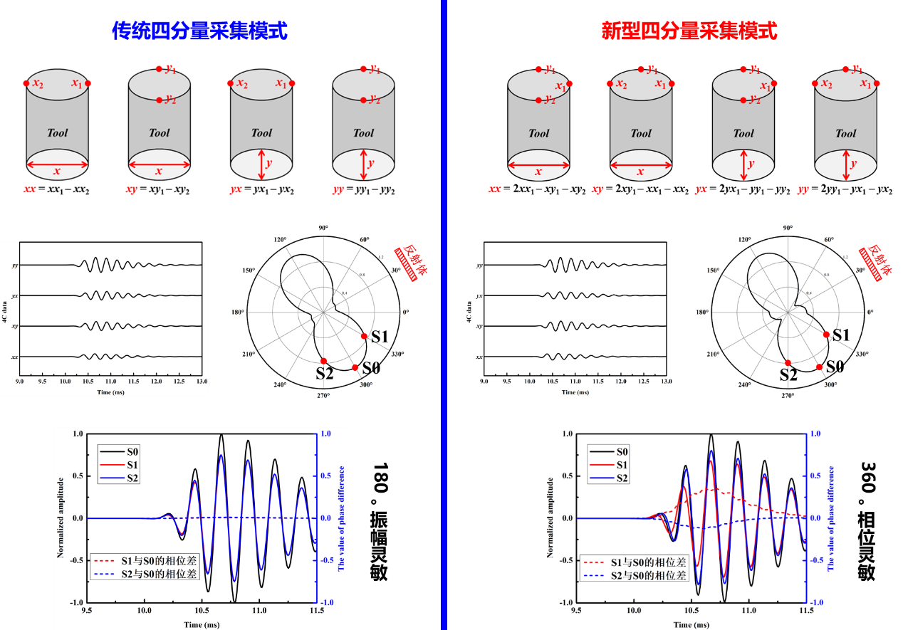 声波远探测成像测井技术是近年来不断发展且在缝洞型非均质储层中被广泛应用的井筒探测新技术,其在溶洞、裂缝等地质异常体的探测中获得了较好的应用成效,是非常规隐蔽性油气藏勘探开发的利器。唐晓明(2004)提出的偶极横波远探测方法具有裂缝探测方位灵敏度高、井外探测距离远、直达信号干扰少等优势,在业界得到了广泛应用。该技术的进一步发展是要解决偶极声源(及接收器)对称性导致的方位180°不确定性问题,如何唯一地确定方位,是本文主要讨论的问题,这对深层油气的开发和施工(如侧钻)至关重要。为消除传统偶极四分量测量模式固有的180°不确定性,我们创新地提出了一种基于井中多方位组合接收消除方位多解性的全方位偶极测量新模式(详见图1),打破了传统的对称接收模式,使得区分方位成为可能。