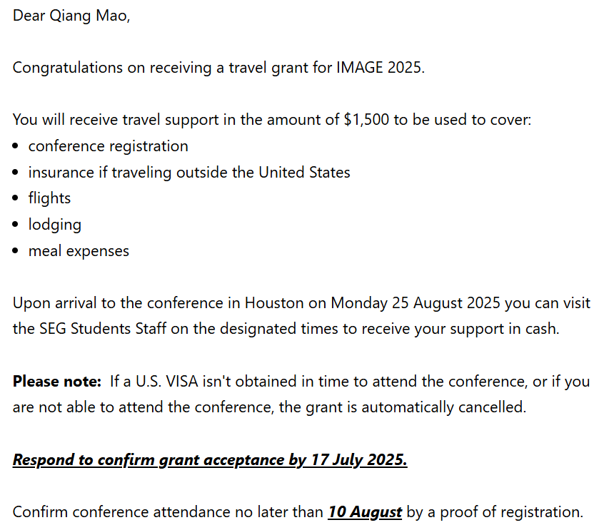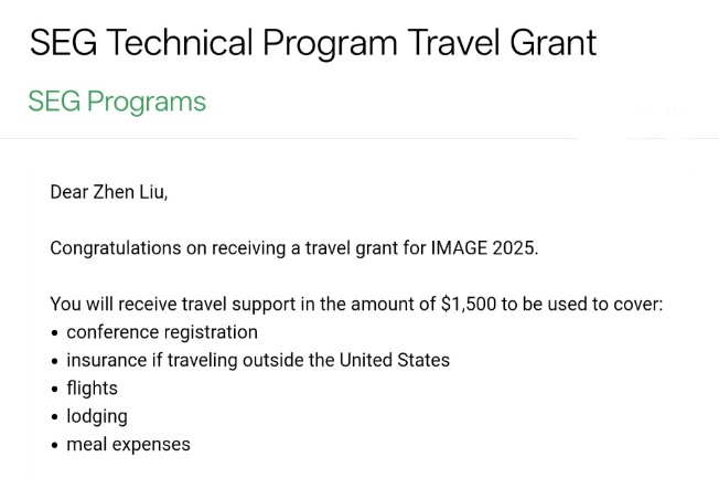 SEG Travel Grant是SEG专门面向全球优秀青年学者设立的专项学术资助项目,具有极高的国际认可度和学术含金量。该奖项每年面向全球所有申请者公开遴选,竞争激烈,获奖比例极低。此次2名博士研究生获奖并受邀参加2025年IMAGE会议,不仅彰显了冰球官网研究生在地球物理领域的学术实力和国际竞争力,也为冰球官网与国际顶尖学会及学者的深入交流与合作搭建了桥梁。