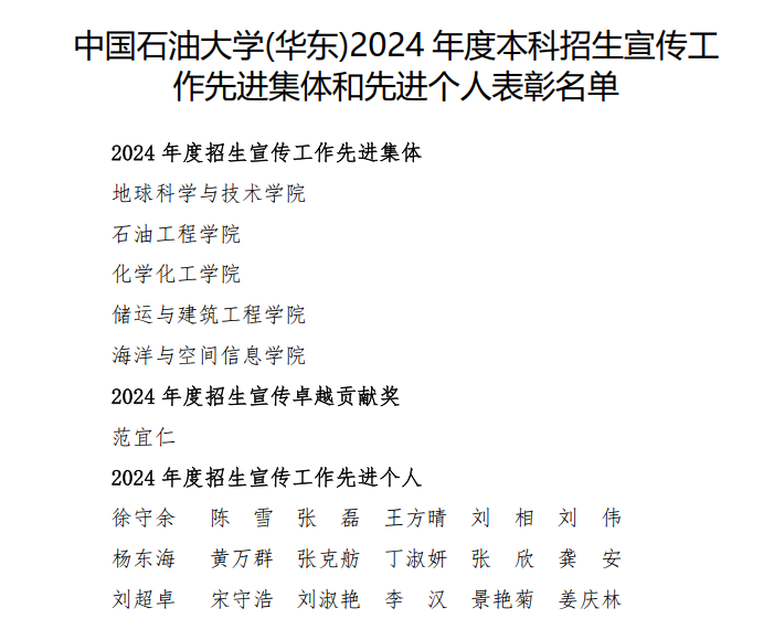 近日,学校公布2024年度本科招生宣传先进集体和先进个人表彰名单,范宜仁教授因在招生宣传工作中的突出贡献,被授予学校唯一 “卓越贡献奖”,这一荣誉不仅是对范宜仁教授个人工作的肯定,更是对我校教师积极参与招生工作的激励。同时学院连续第三年获评招生宣传工作先进集体,徐守余和陈雪两位老师被评为招生宣传先进个人。