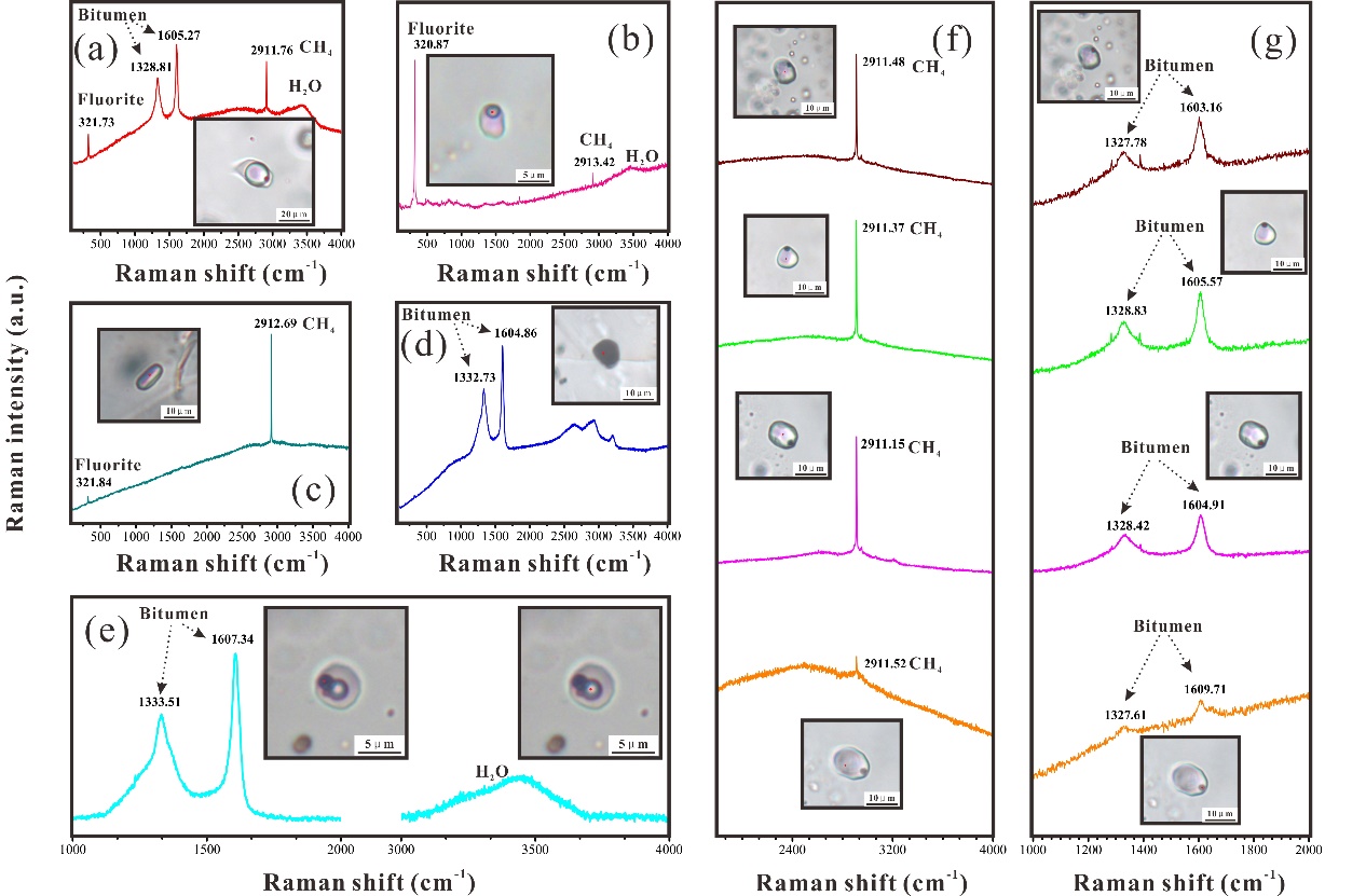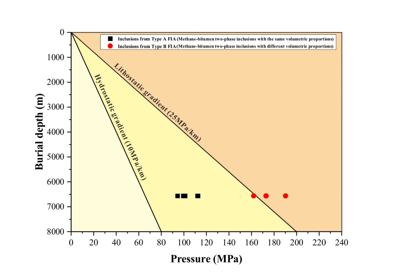 冰球突破豪华版官方网站陈勇教授团队以四川盆地高石梯-磨溪地区震旦系灯影组为研究对象,开展了详细的流体包裹体岩相学分析和流体包裹体压力计算,通过记录原油裂解的特殊包裹体——甲烷-沥青两相包裹体恢复了原油裂解期储层中的流体压力,得到了不同甲烷和沥青体积比的甲烷-沥青包裹体的捕获压力,范围为161.9 MPa至190.2 MPa,平均为174.5 MPa。这些流体压力始终超过相应深度的静水压力,甚至超过岩石静压,表明存在典型的异常超压情况,是原油裂解导致储层流体异常超压的最直接证据。这些信息可以为了解沉积盆地裂解气藏的保存条件提供有价值的参考,对指导未来的深层油气勘探具有重要意义。