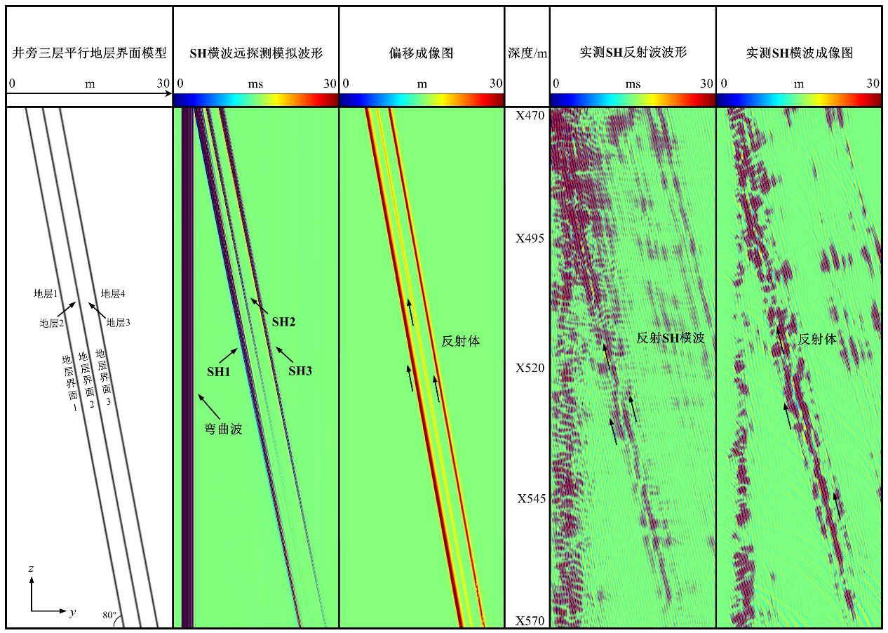 图3 井旁三层平行地层界面模型下解析模拟和现场实测的SH横波远探测波形和成像结果对比