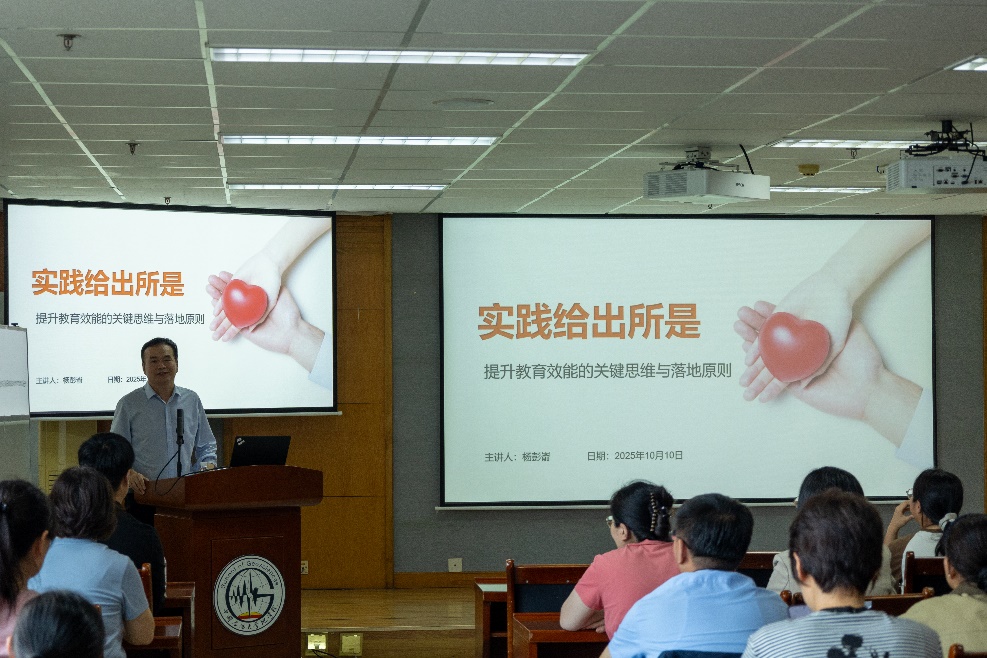 杨彭嵛博士以幽默风趣的语言、睿智透彻的分析以及务实落地的分享风格,带领在场教师深入探寻家庭教育的本质与真相,整场讲座氛围热烈,干货满满。讲座中,杨彭嵛博士围绕 “提升教育效能” 这一核心,从三个关键维度展开深入讲解,为教师们带来了系统性的教育启发。