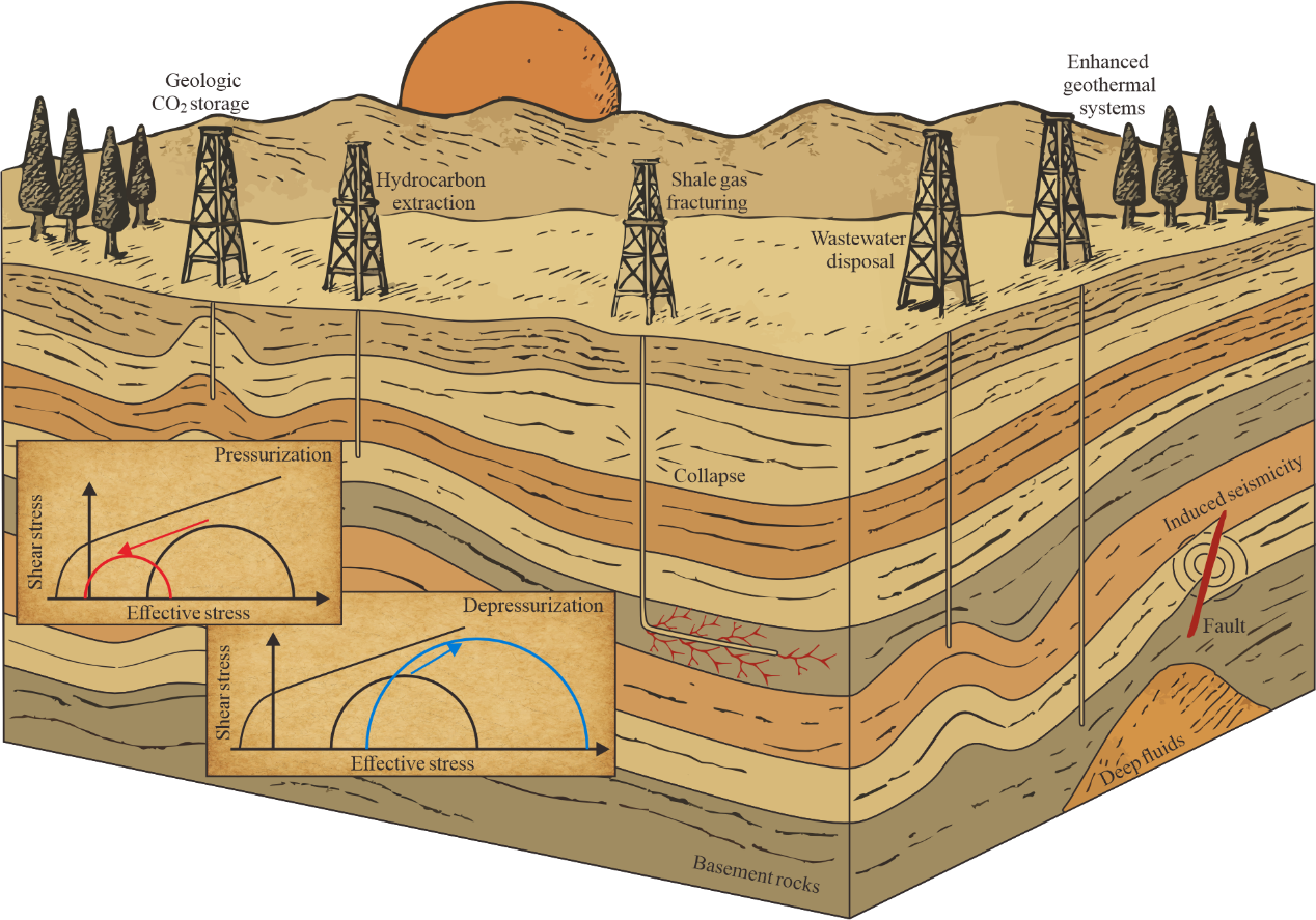 在油气生产、二氧化碳封存、地热开发及地震孕育等过程中,孔隙压力与地应力的协同演化决定了地下介质的稳定性与渗流特征。传统理论常将压力与应力视为独立变量,难以解释储层破裂、断层再激活和诱发地震等复杂现象。该论文拓展“孔隙压力–应力耦合(Pressure–Stress Coupling, PSC)”概念,揭示孔隙压力变化可重新分配应力场,而应力演化又反过来影响孔隙压力,是贯穿储层演化与地质力学过程的重要机制(图1)。