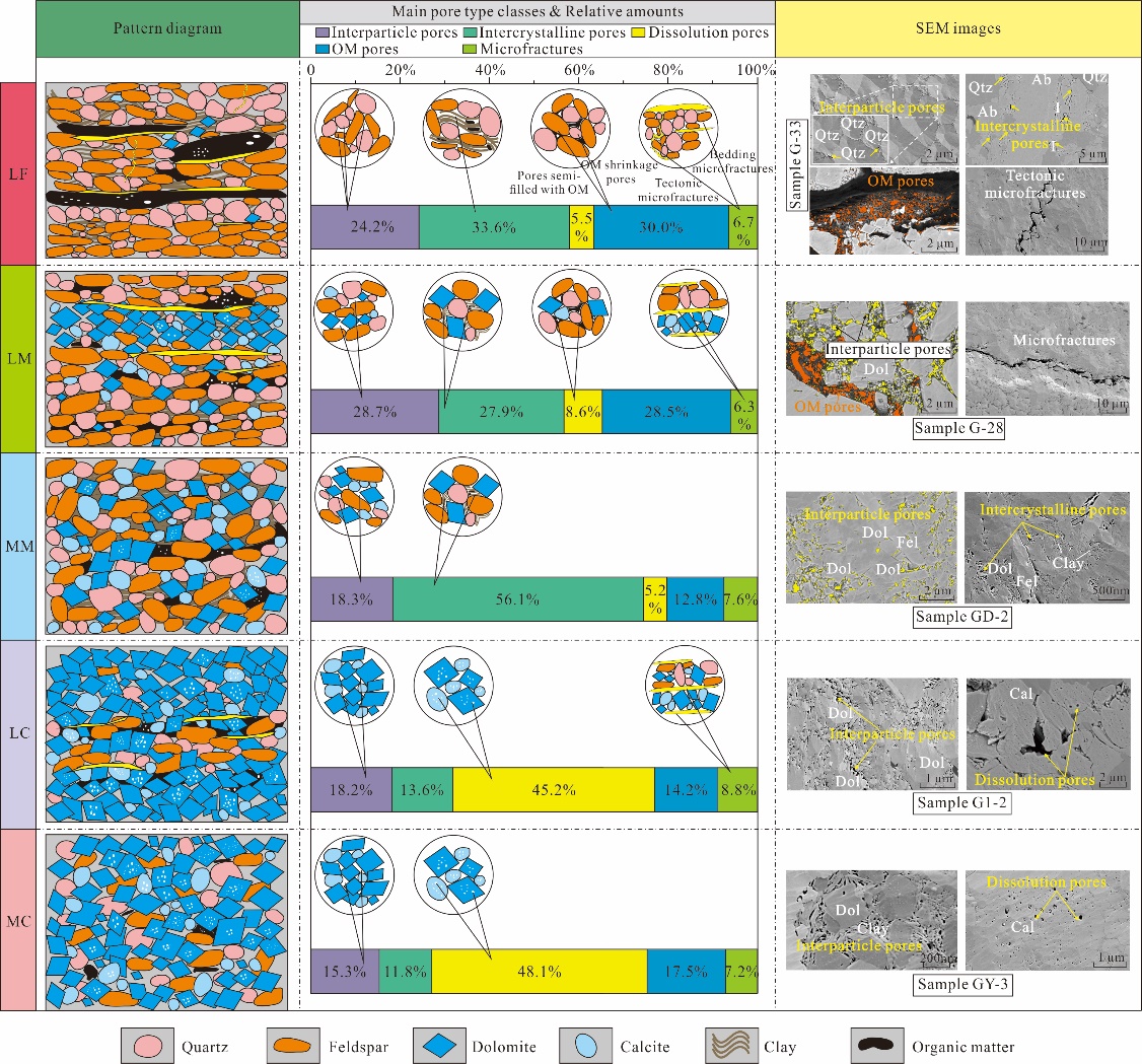 页岩孔隙结构对储层的储集性能、渗流能力及油气富集具有重要意义。页岩的孔隙结构是沉积—成岩接续演化、有机—无机协同作用的产物,表现为孔隙类型、分布及结构的差异,而岩相作为特定沉积环境下沉积岩岩性特征的综合表现,可以直接反映沉积岩的沉积过程,是控制孔隙结构特征的主导因素,因此有必要针对“岩相、孔隙结构、控制因素、发育模式”的耦合机制展开研究。