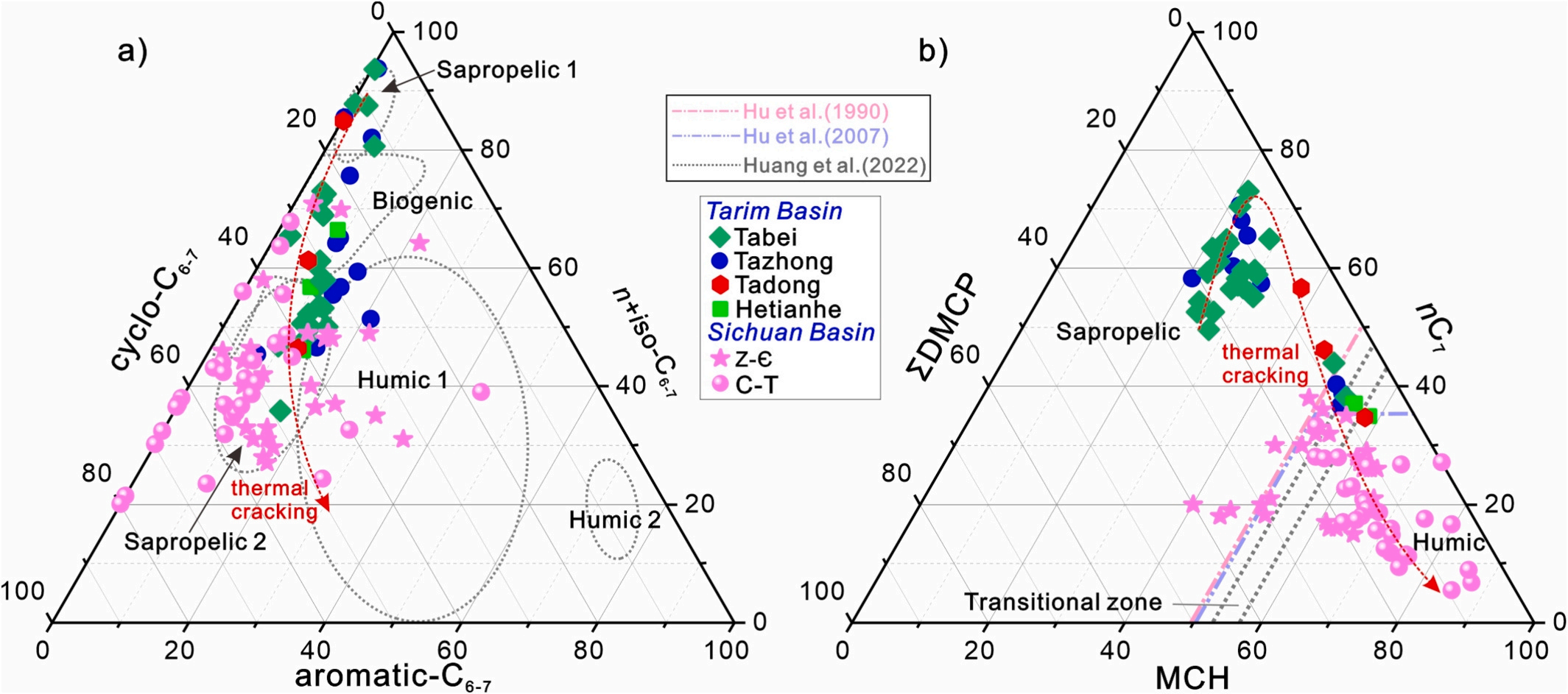 轻烃分子构型复杂,包括了正构烷烃、异构烷烃、环烷烃以及芳香烃类,蕴含了更多的地球化学信息,能够应用于有机物质来源、沉积环境、热成熟度及油气藏次生蚀变作用判识。热裂解作用能够改变轻烃的分布特征,导致相关地球化学指标发生严重蚀变。本研究对塔里木盆地奥陶系的海相原油及其石灰岩储层岩石碎屑进行了封闭体系高温(350-500 °C)和高压(60 MPa)共热实验。随后对热解气中的轻烃进行了定性定量分析,结合C1-C4化合物及其同位素组成,探讨了热裂解过程中轻烃的演化特征(图1),评估了轻烃对热裂解气成因的诊断潜力(图2),探索了评估热成熟度和热裂解强度的新指标。在此基础上,结合对塔里木盆地和四川盆地深层古生界天然气以及四川盆地页岩气样品(图3),展示了该研究的实际应用价值。
