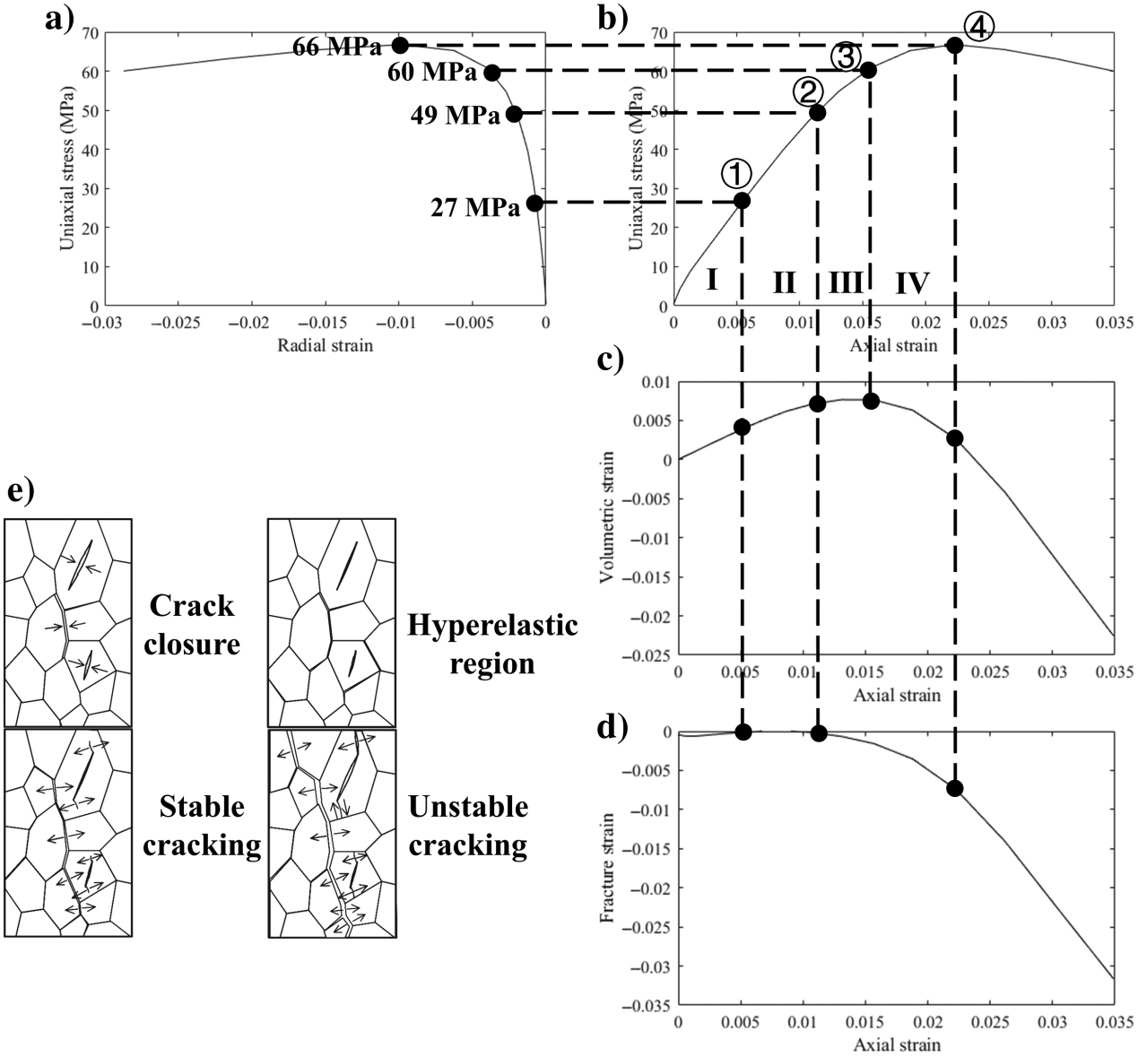 图1. 人工砂岩在单轴压缩下渐进变形的应力-应变图:(a)单轴应力与实测径向应变的关系;(b)单轴应力与实测轴向应变的关系;(c)总体积应变随轴向应变的变化;(d)裂缝体积应变随轴向应变的变化;(e)渐进变形被划分为四个不同阶段,并由四个特征应力水平加以界定和标注