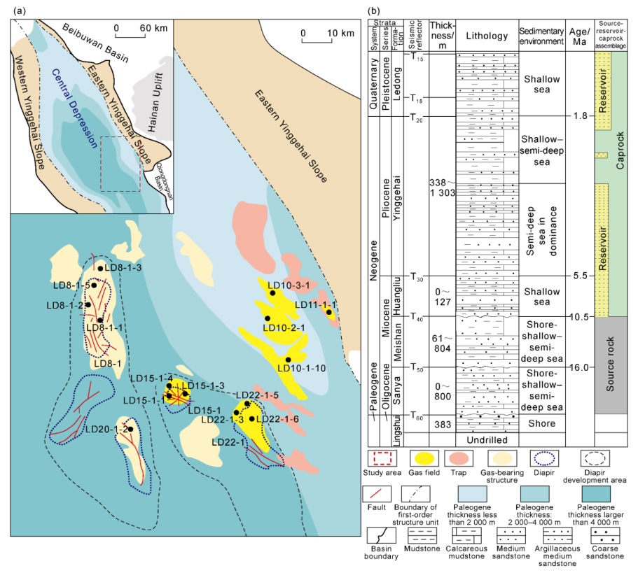 氦气是关乎国家战略安全和高新技术产业发展的关键稀有气体资源,我国长期高度依赖进口,资源安全形势严峻。莺歌海盆地乐东底辟区发育大规模泥流体底辟和深部热流体活动,为氦气的释放与运移提供了有利地质条件(图1),是研究深部热流体背景下氦气运聚机制的天然实验室。