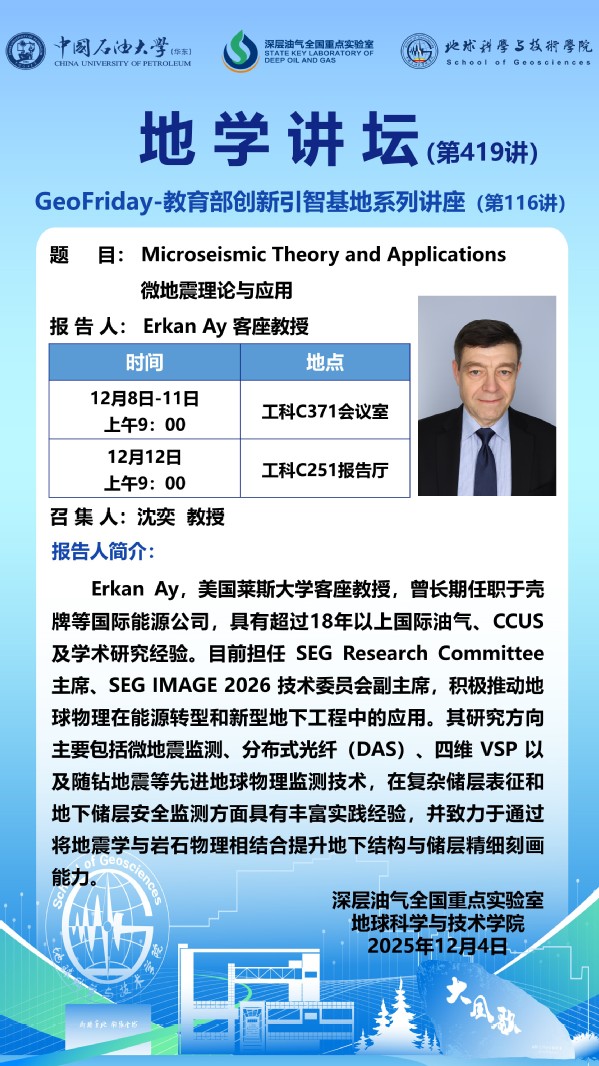 【地学讲坛第419讲】关于Erkan Ay 客座教授《Microseismic Theory and Applications (微地震理论与应用)》系列学术报告的通知