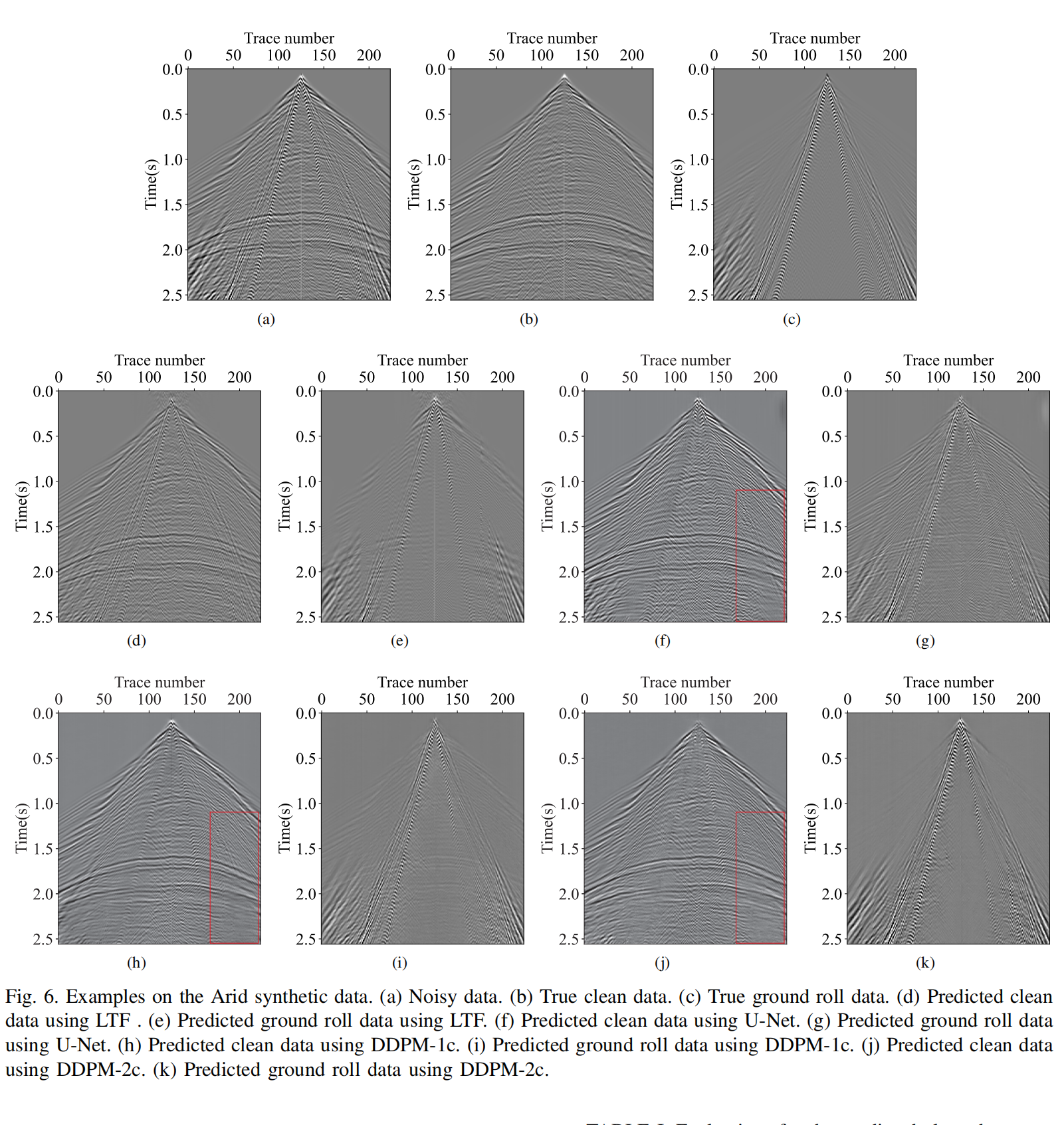 图2 基于SEAM Arid合成数据的示例:(a)含噪数据,(b)真实干净数据,(c)真实面波数据,(d,e)基于 LTF 预测的去噪结果和面波数据,(f,g)基于U-Net预测的去噪结果和面波数据,(h,i)基于 DDPM-1c预测的去噪结果和面波数据,(j,k)基于DDPM-2c预测的去噪结果和面波数据