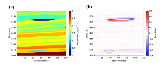 图1. 模型数据 (a)Marmousi2 波阻抗部分模型数据;(b)模型合成地震记录